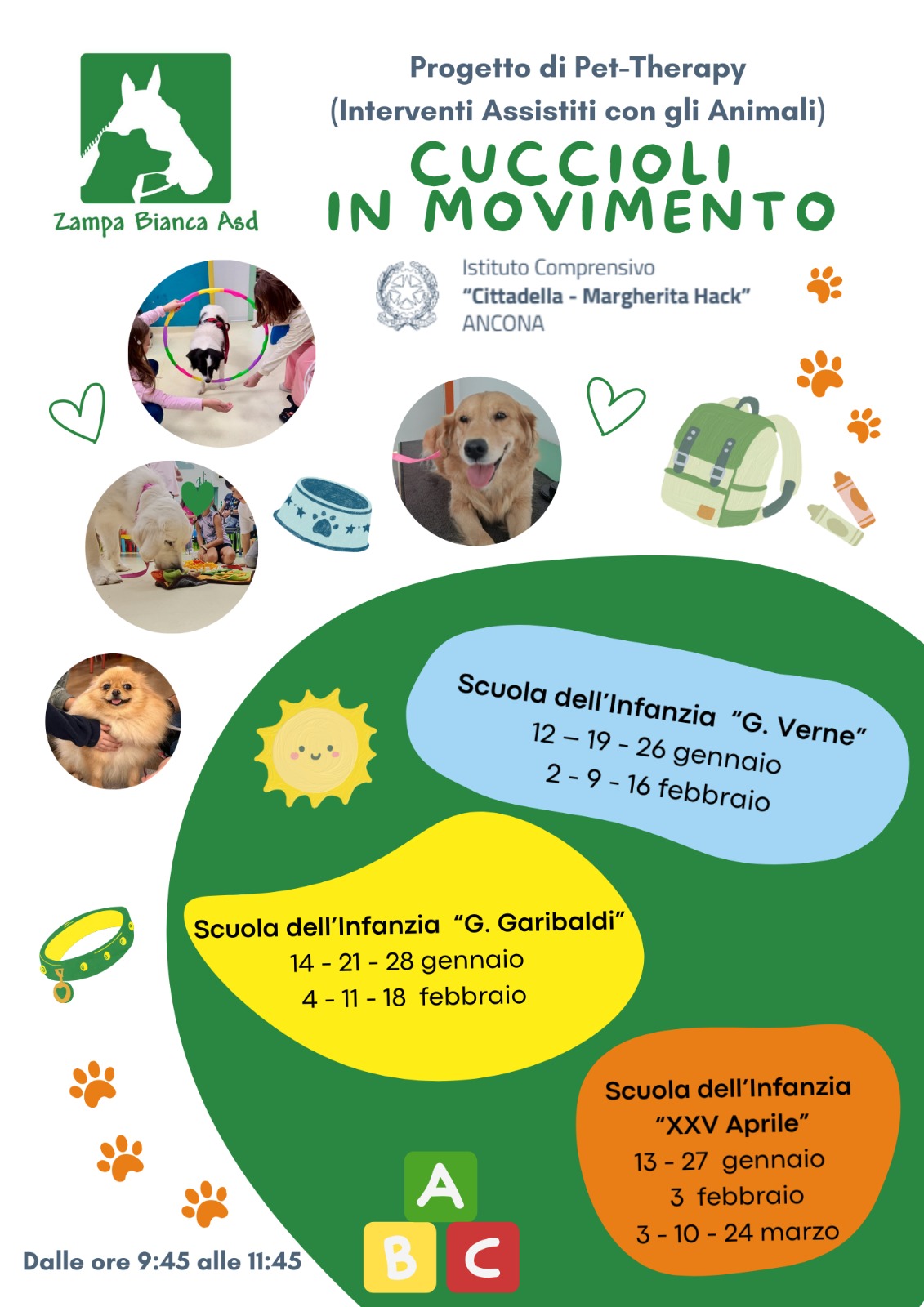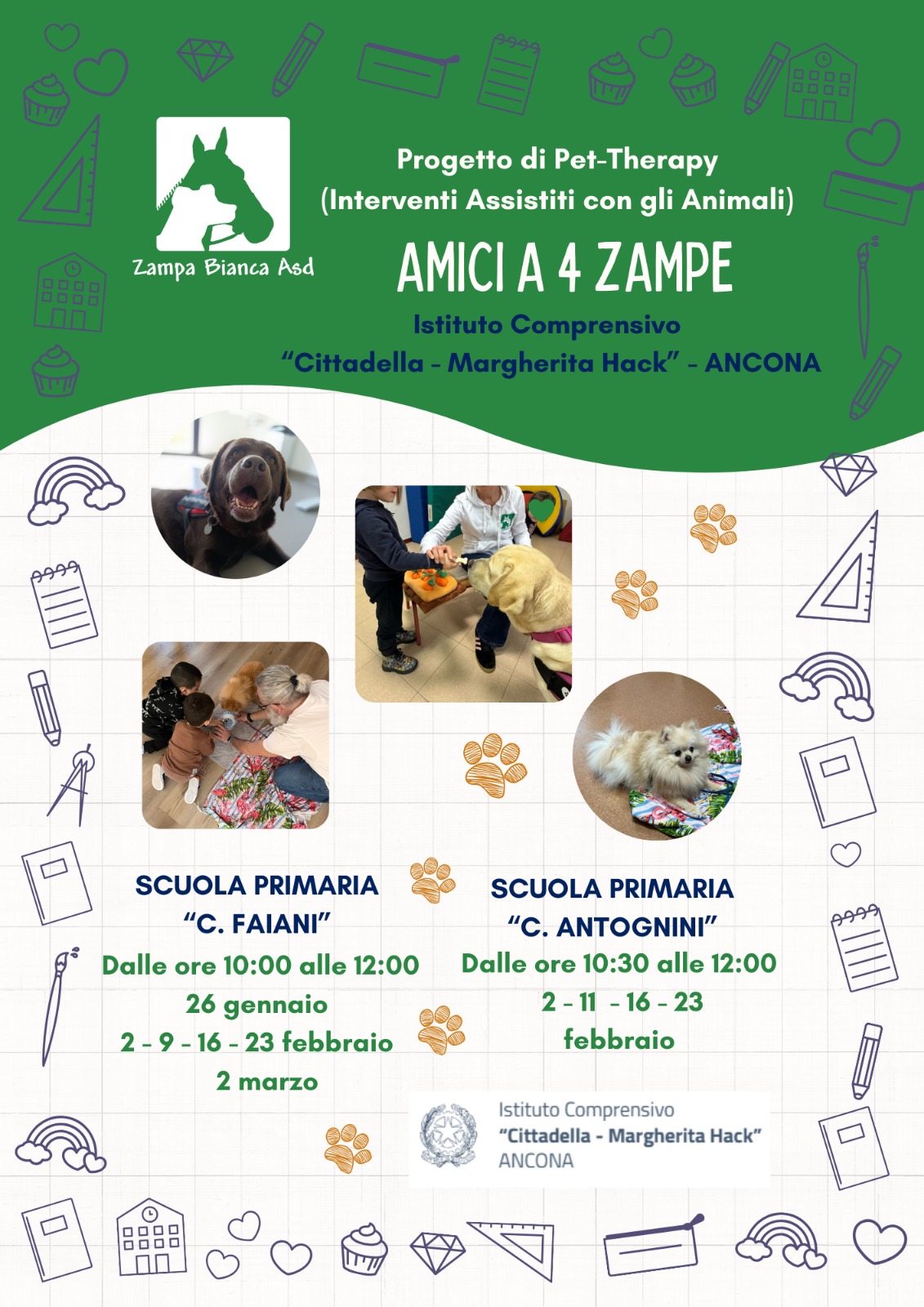 I progetti, che si svolgono in collaborazione con l’associazione “Zampa Bianca”, intendono proporre un breve ma significativo percorso caratterizzato da incontri della durata di un’ora e trenta minuti, a cadenza settimanale, durante i quali potranno essere svolte attività individuali e di gruppo. I progetti rivolti ad alcuni alunni con disabilità possono essere estesi anche al gruppo classe. Oltre alla conoscenza e al rispetto del mondo animale, all’acquisizione delle corrette modalità di approccio e interazione con il cane, i progetti hanno come finalità la stimolazione sensoriale, lo sviluppo dell’empatia e del rispetto verso l’altro, il riconoscimento delle proprie emozioni, l’attivazione dei meccanismi emotivo-affettivi.